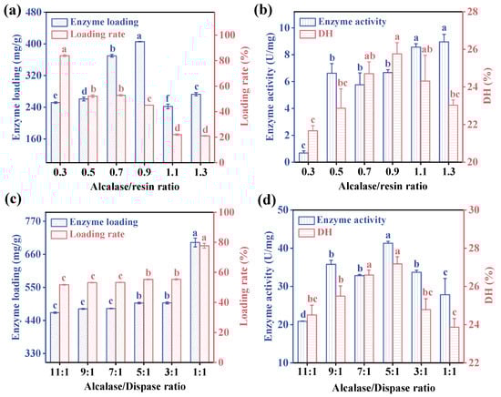(a) The enzyme loading and (b) enzyme activity and DH of immobilized Alcalase with different Alcalase/resin ratio. (c) The enzyme loading and (d) enzyme activity and DH of co-immobilized enzyme under different proportions of two enzymes. Immobilization conditions: temperature = 20 °C, time = 4 h, pH = 9.5 (0.1 M phosphate buffer containing 0.1 M NaCl), and speed = 120 rpm. Different letters indicate significant differences (p < 0.05) in the same column.