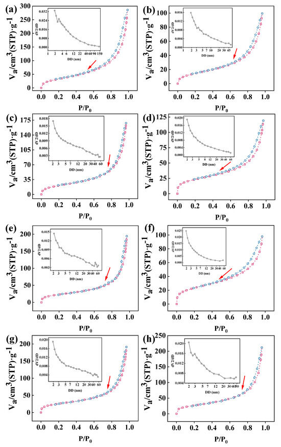N2 absorption–desorption and pore size distribution curve (inset) of samples: (a) resin; (b) activated resin; (c) co-immobilized enzyme11:1; (d) co-immobilized enzyme9:1; (e) co-immobilized enzyme7:1; (f) co-immobilized enzyme5:1; (g) co-immobilized enzyme3:1; (h) co-immobilized enzyme1:1. Sample pretreatment parameters: T1 = 30 °C, t1 = 6 min; T2 = 90 °C, t2 = 30 min; T3 = 90 °C, t3 = 11 min; T4 = 200 °C, t4 = 140 min. Red dots: adsorption. Blue dots: desorption.