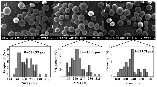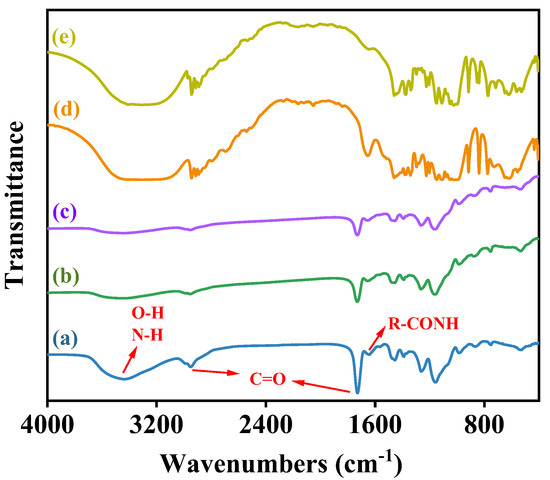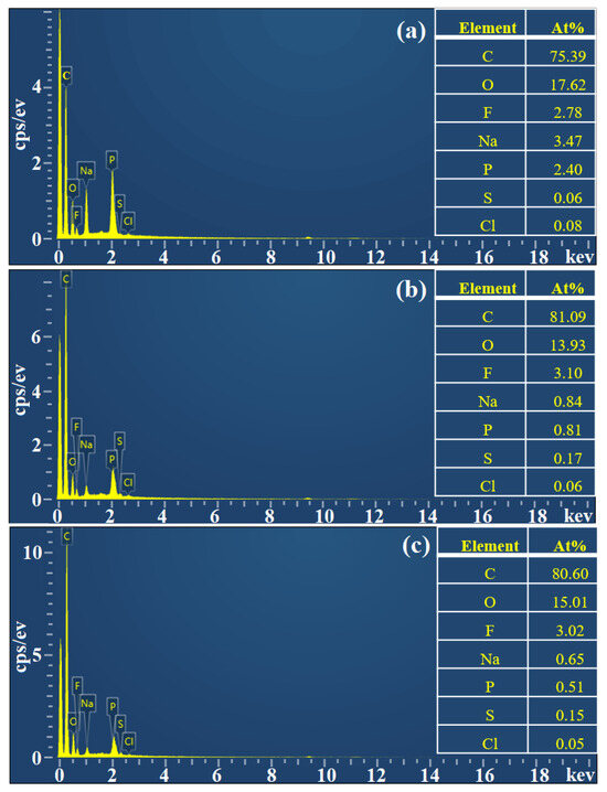 The morphological characteristics of the activated resin, immobilized Alcalase, and co-immobilized enzyme5:1 were observed by scanning electron microscopy (SEM). As shown in Figure 4a, the activated resins exhibited a spherical shape with particles of uniform size and smooth surfaces. Following the immobilization of Alcalase, there was a slight increase in the particle size of the microspheres (from 205.99 μm to 211.39 μm), and the surface became rougher (Figure 4b), indicating the adsorption of enzyme molecules [47]. Upon the addition of Dispase and adjustment to optimal conditions (Alcalase/Dispase = 5:1), the particle size of the microspheres further increased, illustrating that the enzyme molecules were more easily immobilized on the activated resin after the introduction of Dispase [48], which is consistent with our previous results on pore size distribution of the co-immobilized enzyme. Moreover, the activated resin consisted of methyl acrylate and served as a carrier for enzyme immobilization. The FTIR spectra of the activated resin before and after immobilization are shown in Figure 5. The activated resin exhibited characteristic peaks of the carbonyl group (C=O) vibrations of the ester at 1730 cm−1 and methyl vibrations at 2956 cm−1, while the characteristic peak of the amide bond (R−CONH) was located near 1655 cm−1 [49]. In addition, the peaks appearing at 3200–3600 cm−1 are characteristic peaks of overlapping O−H and N−H [50]. After introducing enzymes into the activated resin, the transmittance of these main characteristic functional groups significantly decreased. Next, elemental analysis was performed, and the results are shown in Figure 6, revealing a notable increase in the proportion of S element after enzyme immobilization. This confirmed the successful immobilization of the enzyme, which is rich in S element and is known as a sulfhydryl protease.