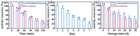 (a) The performance of co-immobilized enzyme5:1 after storage at 50 °C for a certain period of time. (b) Reusability of co-immobilized enzyme5:1 for 7 cycles. (c) Storage stability of co-immobilized enzyme5:1 and free enzyme under the same conditions. Reaction conditions: (a) temperature = 50 °C, pH = 9.5 (0.1 M phosphate buffer); (b) temperature = 37 °C, pH = 9.5 (0.1 M phosphate buffer); (c) temperature = 4 °C, pH = 9.5 (0.1 M phosphate buffer). Different letters indicate significant differences (p < 0.05) in the same column.