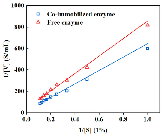 The kinetic parameters of the co-immobilized enzyme were then investigated, and it was revealed from Figure 8 that the Km and Vmax values of the co-immobilized enzyme5:1 were larger than those of the free enzyme, implying a decreased binding of the enzyme to the substrate. This could be attributed to the random rearrangement of the active site of the enzyme molecule during the immobilization process and the size of the resin pore restricting sufficient contact between the macromolecular substrate and the catalytic active site of the enzyme [54,55].
