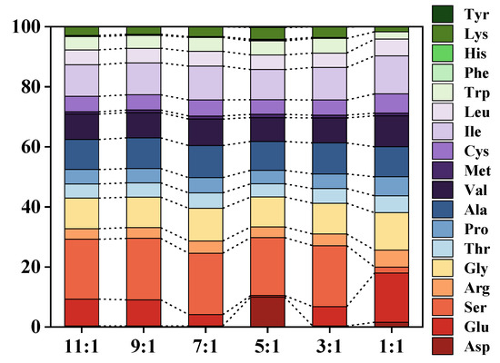 Peptides hydrolyzed by different proteases exhibited distinct amino acid composition and sequence profiles. Alcalase, a non-specific endopeptidase, preferentially recognized Glu, Leu, Lys, Tyr, and Met amino acid residues at its enzyme recognition site. Its activity was found to be broad and peaked under alkaline conditions. In contrast, Dispase was also an endopeptidase, but it specifically targeted the N-terminal amino acid residues of Leu, Phe, and Tyr [23]. It typically operated within a narrow pH range (pH 5 to 8) and exhibited relatively low thermotolerance [56]. The relative ratios of various amino acids are depicted in Figure 9, clearly indicating significant changes in the ratio of certain amino acids (Asp, Glu, Ser) with variations in the proportions of the two proteases. In particular, it was observed that increasing the amount of neutral protease led to a subsequent increase in the content of Tyr, an amino acid that was initially undetected (Table 2). This phenomenon was likely a result of Dispase effectively hydrolyzing the residues targeted by Alcalase, allowing for further hydrolysis by Alcalase and subsequent production of more amino acid fragments. Moreover, regardless of the enzymatic digestion method, the CV protein enzymatic digestion product exhibited a higher content of sweet amino acids compared to bitter amino acids, suggesting a favorable overall taste profile. Based on the results above, the CV protein hydrolysate possessed a well-balanced amino acid composition, suggesting its suitability as a dietary resource for human consumption [57,58].