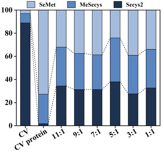 Proportions of Se forms of CV, CV protein, and Se-enriched peptide products at different Alcalase/Dispase ratios of co-immobilized enzyme.