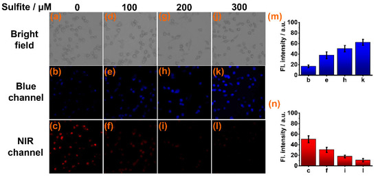 Confocal fluorescence imaging of sensor CY (10 μM) in Caki-1 cells incubated with different concentrations of sulfite: (a–c) 0 μM sulfite; (d–f) 100 μM sulfite; (g–i) 200 μM sulfite; (j–l) 300 μM sulfite. (m) Average fluorescence intensities in blue channel. (n) Average fluorescence intensities in NIR channel.