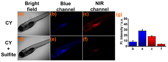 Subsequently, sensor CY was used for detecting sulfite in zebrafish. The zebrafish were cultured in aqueous solution with sensor CY (10 μM) for 60 min. Weak fluorescence was found in the blue channel (Figure 5b) and strong fluorescence was seen in the NIR channels (Figure 5c). When CY-stained zebrafish were further cultured in aqueous solution with sulfite, the fluorescence intensity in the NIR channel appeared to decrease (Figure 5f), but the fluorescence intensity in the blue channel was drastically increased (Figure 5e). These experimental results indicated that sensor CY was suitable for sulfite detection in a live animal environment.