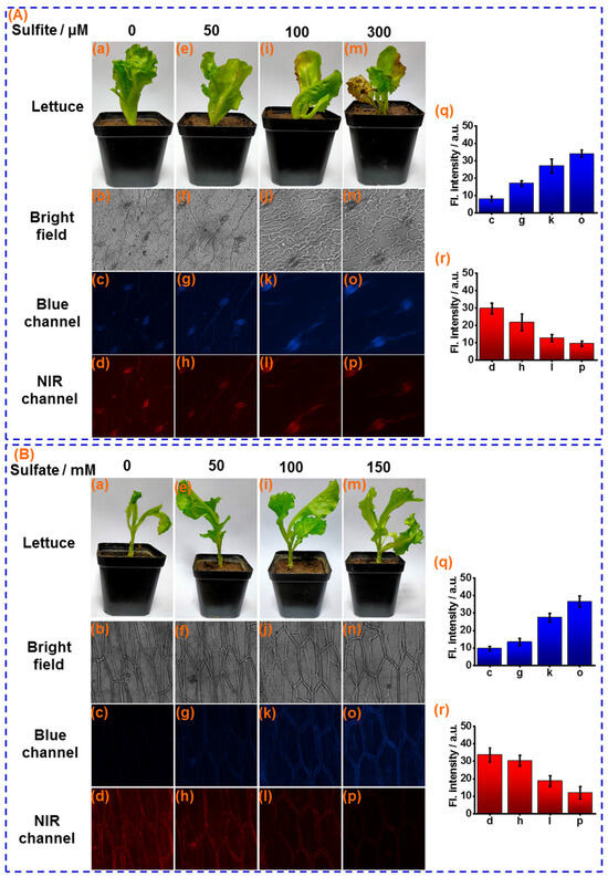 (A) (a,e,i,m): The photo of lettuce leaves after sprayed with 0, 50, 100 and 300 μM sulfite, respectively. Confocal fluorescence images of sensor CY (10 μM) stained lettuce leaf tissues after spayed with different concentration of sulfite for 5 days: (b–d) 0 μM; (f–h) 50 μM; (j–l) 100 μM and (n–p) 200 μM, respectively; (q) Average fluorescence intensities of blue channel; (r) Average fluorescence intensities of NIR channel. (B) (a,e,i,m): The photo of sensor CY stained lettuce tissue after cultivated with 0, 50 mM, 100 mM and 150 mM sulfate, respectively. Confocal fluorescence images of sensor CY (10 μM) stained lettuce leaf tissues after cultivated with different concentration of sulfate for 7 days: (b–d) 0 mM; (f–h) 50 mM; (j–l) 100 mM and (n–p) 150 mM, respectively; (q) Average fluorescence intensities of blue channel; (r) Average fluorescence intensities of NIR channel.