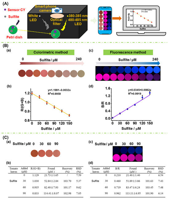 (A) A schematic picture of the portable sensing system. (B) (a) Colorimetric response of sensor CY to sulfite (0–240 μM) in PBS buffer solution captured by portable sensing system; (b) the linearity of the R/(G + B) value with sulfite concentrations in panel (a); (c) fluorescence response of sensor CY to sulfite (0–240 μM) in PBS buffer captured by portable sensing system; (d) the linearity of the B/R value with sulfite concentration in panel (c). (C) Measurement of sulfite content in tomato leaf by sensor CY and portable sensing system via colorimetric method and fluorescence method, respectively; (a): the changes in signal outputs of sensor CY with tomato leaf extract spiked with increasing contents of sulfite; (b) the determined sulfite content in tomato leaf extract; (c) the changes in signal outputs of sensor CY with tomato leaf extract spiked with increasing content of sulfite; (d) the determined sulfite content in tomato leaf extract.