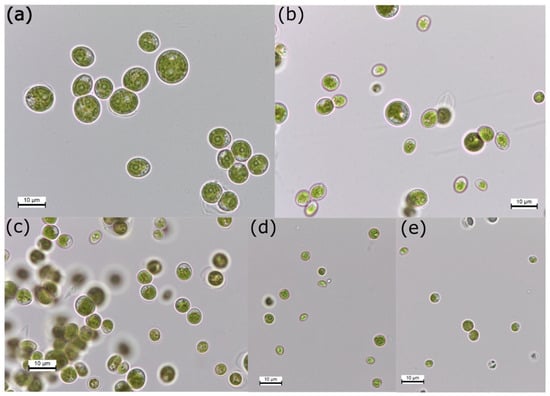 Light microscopy photomicrographs of 5 unialgal strains isolated in this work after two months of growth: (a) Coelastrella sp. LFR1; (b) Coelastrella sp. LCF3; (c) Coelastrella sp. LFA2; (d) Chlorella sp. LFA1; and (e) Chlorella sp. LCF1. Scale bar = 10 µm.
