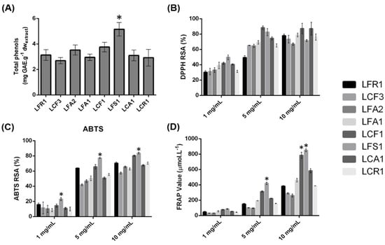 In order to determine the antioxidant activity of the extracts, the radical scavenging activity was evaluated using the DPPH and ABTS methods and the reducing power using the FRAP method [52,53]. The DPPH and ABTS methods simulate the presence of ROS (reactive oxygen species) through organic radicals that disappear in the presence of antioxidant compounds [48]. FRAP assesses the ability of extracts to donate an electron by reducing the ferric ion (Fe3+) to the ferrous ion (Fe2+) [54]. The DPPH and ABTS scavenging activity and FRAP value (µmol.L−1) were determined for the eight different extracts at concentrations of 1, 5 and 10 mg.mL−1 (Figure 3). All extracts showed high DPPH and ABTS scavenging activity at the highest concentration of 10 mg.mL−1. The lowest percentage of DPPH scavenging activity for this concentration was obtained for the LFA2 extract of 66.91 ± 1.48% and the highest of 87.21 ± 6.84% for the LCF1 extract. For the extract concentration of 1 mg.mL−1, the LFS1 extract showed the highest DPPH scavenging activity of 49.68 ± 3.14%. The same extract was also the one that showed the highest percentage of antioxidant activity for the three concentrations by the ABTS method. For the highest extract concentration of 10 mg.mL−1, LFS1 reached the ABTS scavenging activity of 83.61 ± 1.10%. The remaining extracts at the highest concentration (10 mg.mL−1), present a percentage between 57.39 ± 1.38 and 80.26 ± 0.90% of ABTS scavenging activity.