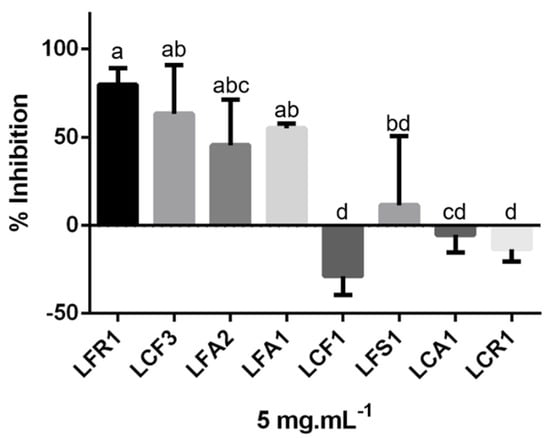 Against Listeria and Salmonella, the extracts that showed an inhibitory effect were LFR1, LCF1, LFS1 and LCA1, and the minimum inhibitory concentrations for bacterial growth would have to be greater than 5 mg.mL−1. LCF1 was the extract that showed the greatest inhibitory effect at the highest concentration tested, 43.22 ± 2.27% and 28.26 ± 0.86% for Salmonella and Listeria, respectively. As observed in E. coli, the remaining extracts did not show inhibition for Listeria and Salmonella; in contrast, the LCF3, LFA2 and LFA1 extracts promoted bacterial growth greater than 50% at concentrations of 5 mg.mL−1. Although bacteria are often considered a contamination in microalgae culture, studies confirm that microalgae and bacteria can synergistically affect each other’s metabolism [56]. These interactions exist in natural habitats, and their interruption often makes it impossible to isolate microalgae in the laboratory [57]. The extracts in this study were obtained from photobionts isolated from lichens, that is, microalgae that live in symbiosis with a fungus and often also with cyanobacteria and other bacteria. Some of the consortia between the photobiont and cyanobacteria and/or bacteria could not be isolated, as is the case of LFS1, LCA1 and LCR1. Thus, the possibility that some of the extracts under study have a potentiating effect on bacterial growth may be due to the existence of organic matter in the extracts, which results in sources of carbon, sulfur, nitrogen or phosphorus for bacteria.