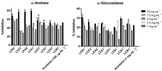 The evaluation of the activity of specific enzymes responsible for sugar metabolism allows us to infer the antidiabetic power of extracts and/or compounds [61]. The inhibition of α-amylase and α-glucosidase slows the absorption of glucose, as these enzymes are involved in the breakdown of ingested carbohydrates, becoming an effective strategy for diabetes management [62]. Thus, the screening of antidiabetic activity has been performed in five concentrations of the eight extracts of photobionts isolated from lichens by evaluating their inhibition power of α-amylase and α-glucosidase. The results obtained are shown in Figure 5. Coelastrella sp. extracts and LFA1 exhibited α-amylase inhibition greater than 67% at a concentration of 10 mg.mL−1. The remaining extracts also showed relevant inhibitory activity, and LCR1 was the extract with the lowest percentage of inhibition, 46.27 ± 1.05% for the highest concentration of extract. Previous studies showed that Chlorella pyrenoidosa extracts show an α-amylase inhibitory rate of 26.25% up to a concentration of 1 mg.mL−1 [63]. All extracts from the present study, at a concentration of 1 mg.mL−1, show an inhibitory effect superior to that described by Zheng Sun for this enzyme [63].