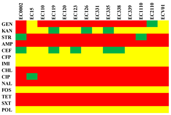 Phenotypic antibiotic resistance profile of E. coli isolates. GEN: gentamicin, KAN: kanamycin, STR: streptomycin, AMP: ampicillin, CEF: cefepime, CFP: cefoperazone, IMI: imipenem, CHL: chloramphenicol, CIP: ciprofloxacin, NAL: nalidixic acid, FOS: fosfomycin, TET: tetracycline, SXT: trimethoprim/sulfamethoxazole, and POL: polymyxin B. The figure shows antimicrobial susceptibility as resistant (red), intermediate (green), or susceptible (yellow).