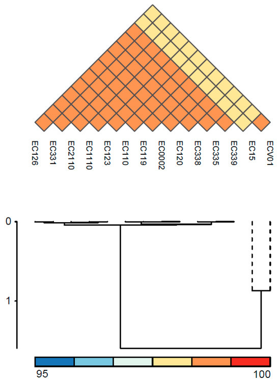 The MLST profiles of diverse E. coli isolates, determined by specific gene alleles, revealed both shared characteristics and unique distinctions in their genetic composition (Table 1). Notably, isolates EC0002, EC110, EC119, EC120, EC123, EC126, EC331, EC335, EC338, EC339, EC1110, and EC2110 exhibited identical alleles across all seven MLST genes, resulting in the assignment of ST93. In contrast, isolates EC15 and ECV01 displayed distinctive alleles for several MLST genes, leading to the assignment of distinct sequence types (ST1148 and ST1196, respectively). The serotype profiles of E. coli isolates unveiled a predominant pattern across the strains (Table 1). Most of the isolates consistently exhibited O7 and H4 antigen types. In contrast, EC15 and ECV01 presented distinct serotypes with O163 and H7, and O22 and H28 antigens, respectively. To assess genomic relatedness and delineate distinctions among the E. coli isolates, we computed pairwise ANI for all possible genome pairs (Figure 2). The E. coli isolates were categorized into two groups, with EC15 and ECV01 forming a distinct, independent group. The ANI values across the bacterial isolates ranged from 98.33 to 100.00%.