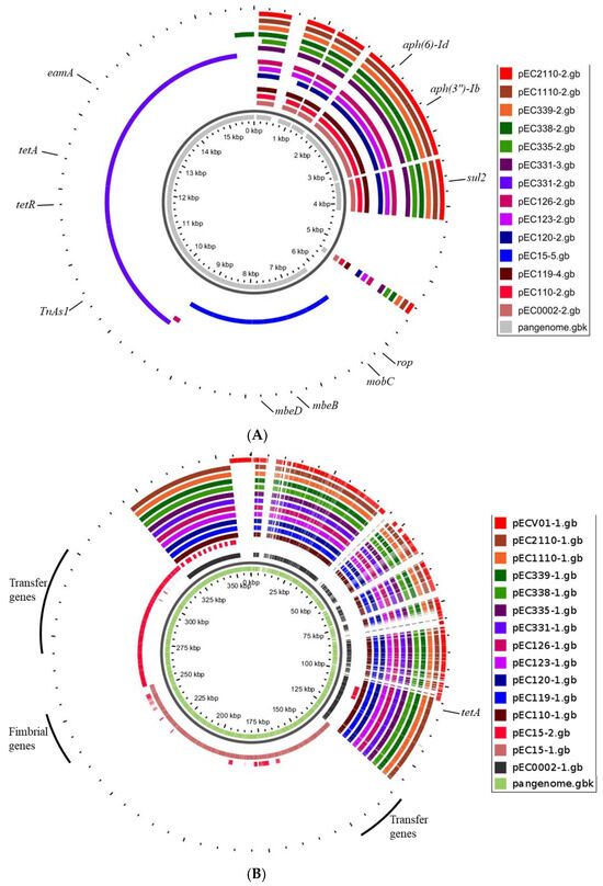 Pangenome mapping of E. coli genomes. The pangenome was constructed using CGView, involving the incorporation of distinctive regions into the reference genome (E. coli ATCC 8739). Gaps in the map signify regions where genes are absent in the reference genome but are present in other genomes. Pangenome analysis revealed a high degree of similarity among most plasmids. However, a small number contained additional DNA sequences incorporating specific genes (Figure 4A,B). We observed notable differences in the sequences of the pEC15-5 and pEC331-2 plasmids compared to others (Figure 4A,B). Specifically, pEC15-5 carried DNA replication and transfer genes, including rop, mobC, mbeB, and mbeD, while pEC331-2 contained tetracycline-resistant genes, tetA and tetR. Additionally, all plasmids shared the presence of aminoglycoside- and sulfonamide-resistant genes, including aph(6)-Id, aph(3″)-Ib, and sul2 genes.