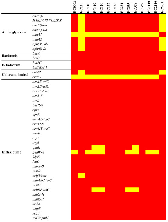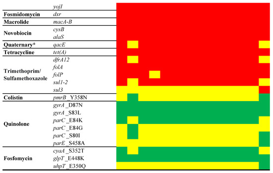 Antimicrobial resistance determinants in the E. coli chromosome. The figure shows the presence (red for antimicrobial resistance genes or green for point mutations) or absence (yellow) of antimicrobial resistance genes. * Quaternary ammonium compound.