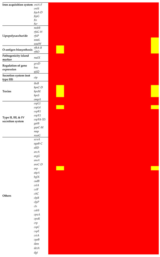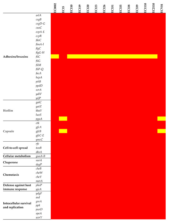 A set of adhesion/invasion genes (aslA, csgB, csgD-G, cusC, ecpA-E, ecpR, fdeC, fimA-I, flgC, flgG-H, fliG, fliM, fliP-Q, focA, hcpA, pitB, ppdD, serA, ydiV, and yijP) was consistent across the chromosomes of all isolates (Figure 6). The intriguing absence of the flagellin (fliC) gene in all isolates except for EC15 and ECV01 added complexity to the observed gene profile variations among these isolates. Biofilm-related genes had consistent patterns, with gatC, gatZ, kbaY, and luxS present in all but pgaA absent in EC15 and ECV01. Capsule gene analysis revealed variable prevalence, with etk, gfcA, gfcC-E, and ymcC consistently present; however, gfcB varied, being absent in EC15 and ECV01. Iron acquisition genes entA-F, entS, fepA-D, fepG, fes, and fur were uniformly present, indicating shared iron acquisition capacity.