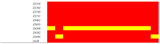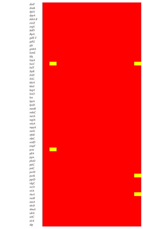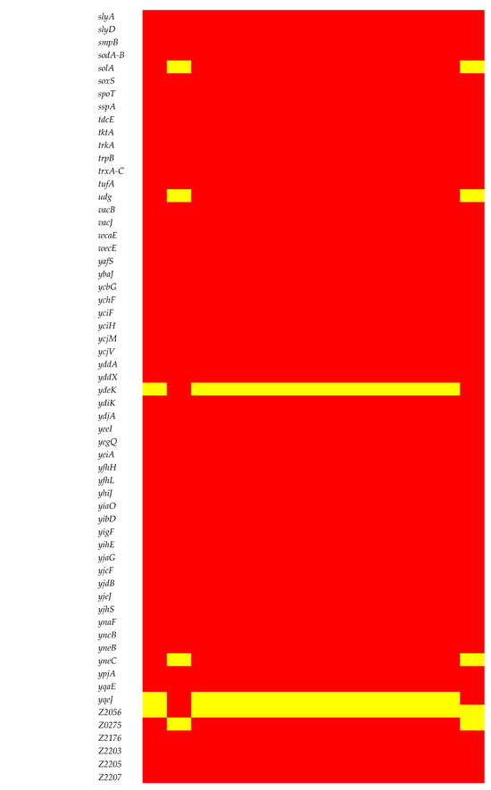 Virulence determinants in the E. coli chromosome. The figure shows the presence (red) or absence (yellow) of virulence genes.