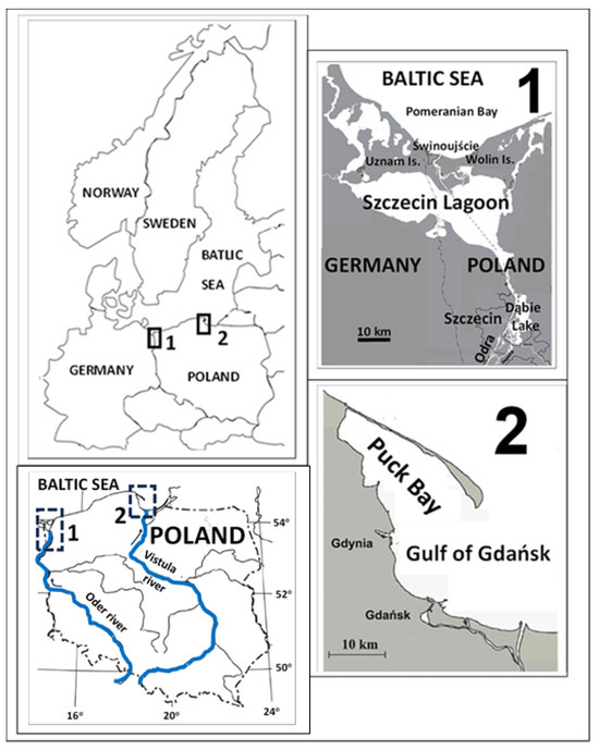 Study areas (1—Dąbie Lake and Szczecin Lagoon; 2—Puck Bay).