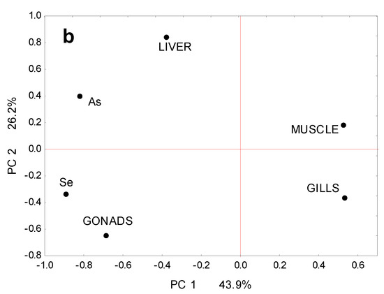 The observed higher concentration of Se than total As is typical for fish (e.g., Milošković and Simić [23]). This is due to the physiological function of Se, which, at the appropriate level, supports the growth and development of fish, enhances the antioxidant capabilities of the organism, and supports immune functions [66]. Significantly higher Se accumulation rates in gonads and liver (metabolically highly active organs) compared to other tissues and organs have also been observed in previous studies [17,67,68]. Similarly, high bioaccumulation of the highly toxic As is noted in the liver of fish, an organ where detoxification occurs, followed by the gills (absorption of As from the water phase), and the lowest in the muscles (which do not actively participate in detoxification processes) [69,70]. These physiological and metabolic functions of the investigated parts of round goby’s body may provide a physical explanation for the demonstrated differences in the PCA plot in our study (Figure 2b).