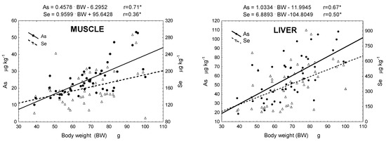 The demonstrated proportional correlation between total As and Se concentrations in the investigated body parts and the body weight of round goby was consistent with the frequently observed relationship in fish, where the bioaccumulation of both essential and non-essential trace elements increases with age, and consequently, with size and weight (e.g., Canpolat et al. [72]). However, as noted by Kaçar [70], there are is clear and consistent relationship between the content of trace elements in individual body parts and the size of fish. Our studies partially confirmed this as correlations were not always significant.