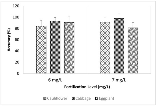 According to Figure 2, for the 6 mg/L fortification level, eggplant showed the highest accuracy with 90.87% and cauliflower showed the lowest accuracy with 84.30%. For 7 mg/L fortification level, cabbage showed the highest accuracy with 97.85% while eggplant showed the lowest accuracy with 81.14%.