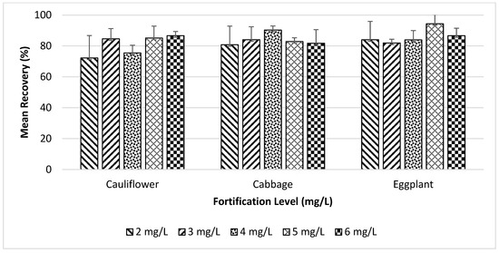 Figure 3 shows the percentage of mean recovery and relative standard deviation (RSD) for cauliflower, cabbage, and eggplant, respectively. The mean recovery for cauliflower at the 2, 3, 4, 5, and 6 mg/L fortification level was 72.21%, 84.64%, 75.45%, 85.07%, and 86.64%, respectively. The mean recovery for cabbage at the 2, 3, 4, 5, and 6 mg/L fortification level was 80.80%, 84.02%, 90.26%, 82.86%, and 81.74%, respectively. The mean recovery for eggplant at the 2, 3, 4, 5, and 6 mg/L fortification level was 83.98%, 81.93%, 83.89%, 94.34%, and 86.61%, respectively.