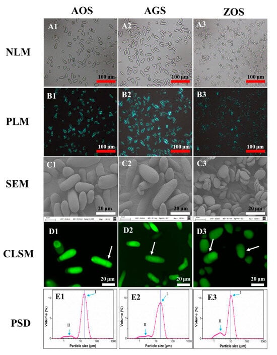 Herein, various morphological analytical techniques, including optical microscopy, confocal laser scanning microscopy, and scanning electron microscopy, were employed to investigate the granule characteristics of these rhizome starches. No discernible contaminants were observed (Figure 1(A1–A3)), confirming that the isolated starches had sufficiently high purity suitable for subsequent analysis. Interestingly, AOS and AGS exhibited an elongated shape, differing from commonly known round starch particles. The shape of ZOS granules was found to be elliptical, and triangular flake forms with diameters ranging from 2 to 16 μm were consistent with previous findings [,]. The starch granule sizes of AOS and AGS were 8–26 and 6–28 μm, respectively. The size and shape distribution of starch granules exhibited variations across different plant species, thereby influencing the functional properties of starch.