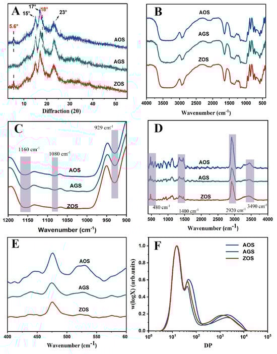 FTIR was used to analyze differences in the starch helical structure. In all the starches in the spectra (Figure 2B,C), an extremely broad band appeared at 3450 cm−1 as a stretching vibrational peak of the free hydroxyl group (-OH); the peaks at 1160 cm−1 and 1080 cm−1 were related to the C-O stretching vibrational peaks of C-O-H; and 929 cm−1 was the asymmetric stretching vibrational peak of the D-glucopyranose ring [,]. These peaks are typical starch absorption peaks. However, no new absorption peaks appeared, indicating that the three starches of the same family are chemically bonded in the same way. In these peak plots, it is not difficult to find that there are clear differences in the intensities exhibited by the three starch types in these peaks, which may be caused by the fact that the three starches contain different amounts of these groups as well as the different crystallinities of the starch. In the spectrograms, the 1047 cm−1, 1022 cm−1, and 995 cm−1 bands are commonly used to reflect the ordered and double helical structure of starch. Therefore, R1047/1022 and R995/1022 were used to assess the degree of order and the amorphous content of starch []. The R1047/1022 and R995/1022 of AOS were higher than those of AGS and ZOS (Table 2). It indicates that AOS has more ordered and double helical structures among the three starch types, which is a result that is consistent with the previous crystallinity results.