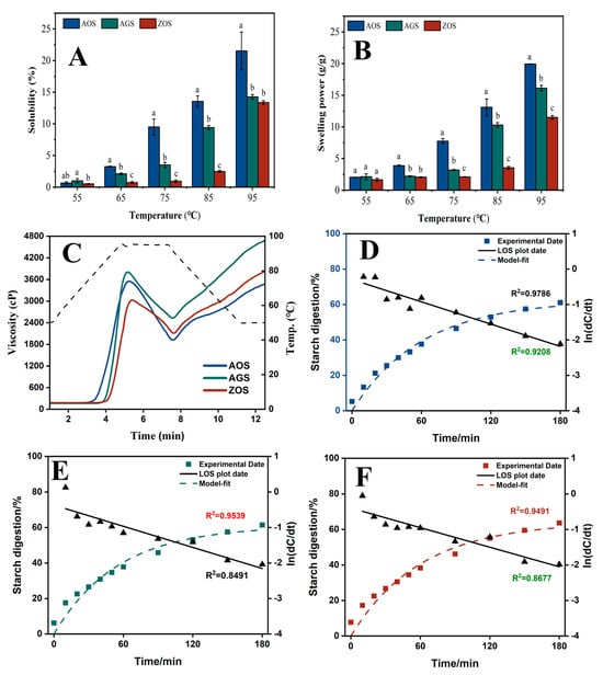 Solubility (A), swelling power (B) and RVA curves (C), digestion curves, model fit curves, and LOS plots ((D), AOS; (E), AGS; (F), ZOS) for the three rhizome starches. Different characters (a–c) on the top of columns represent significant differences between the AOS, AGS, and ZOS (at the same temperature), p < 0.05 level.