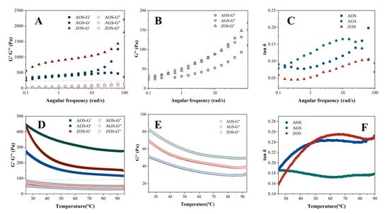 The temperature scanning rheological curves of the three starch gels are shown in Figure 4D,E. The G′ values of all starch gels are larger than G″, and the tan δ values are less than one, indicating that the elastic behavior is larger than the viscous behavior of all samples. As the temperature rises, all the starch gels show similar trends, with the energy storage modulus and loss modulus showing a decreasing trend from the beginning of the temperature rise, followed by stability. It indicates that as the temperature increases, starch granules gradually expand, the crystalline regions remaining in the starch granules melt, the starch granules deform, rupture, and disintegrate, and the molecular mobility increases, leading to the weakening of interchain interactions, which, in turn, leads to a gradual decrease in G′ and G″ []. Under the same temperature conditions, the G′ and G″ of AOS and ZOS were significantly higher than those of AGS, indicating that these two starch paste systems have more entanglement points between molecular chains within the gel system and the network structure of the gel system is stronger, i.e., it has a stronger three-dimensional network structure.