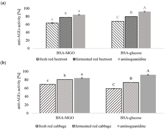 Figure 1. Anti-glycation properties of fresh and fermented red cabbage (a) fresh and (b) fermented red beetroot. Two model systems were of bovine serum albumin with methylglyoxal (BSA-MGO) and BSA with glucose (BSA–glucose). Bars followed by the same letter, calculated for each model system separately, were not significantly different (p < 0.05) according to Tukey’s test.