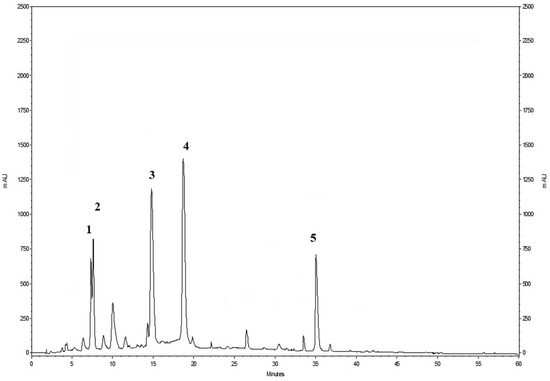 Figure 1. The HPLC profile of the phenolic compounds of a pomegranate by-product extract was detected at 378 nm. (1) Punicalin A; (2) punicalin B; (3) punicalagin A; (4) punicalagin B; (5) ellagic acid.