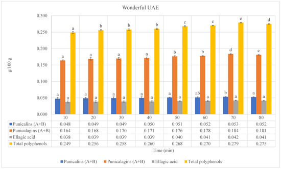 Figure 2. Phenolic compounds (punicalins, punicalagins, and ellagic acid), “a”, and total polyphenols, “b”, of Wonderful pomegranate by-product extracts obtained by ultrasound-assisted extractions (UAEs) “a”: values expressed as grams of standard compounds per 100 g of extract (g/100 g extract). “b”: values expressed as grams of gallic acid equivalents (GAEs) per 100 g of extract (g GAEs/100 g extract). Values are expressed as the mean ± standard deviation (SD). Mean values with different letters (a–d on the bars denote statistical differences (p < 0.05) among different extraction times for both phenolic compounds and total polyphenols.