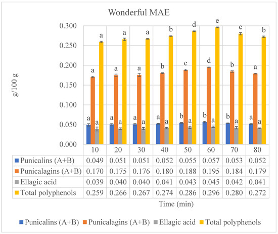 Figure 3. Phenolic compounds (punicalins, punicalagins, and ellagic acid), “a”, and total polyphenols, “b”, of Wonderful pomegranate by-product extracts obtained by microwave-assisted extractions (MAEs). “a”: values expressed as grams of standard compounds per 100 g of extract (g/100 g extract). “b”: values expressed as grams of gallic acid equivalents (GAEs) per 100 g of extract (g GAEs/100 g extract). Values are expressed as the mean ± standard deviation (SD). Mean values with different letters (a–e) on the bars denote statistical differences (p < 0.05) among different extraction times for both phenolic compounds and total polyphenols.