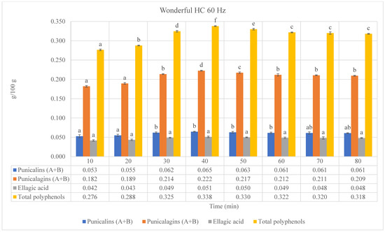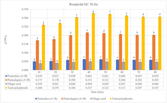 Figure 4. Phenolic compounds (punicalins, punicalagins, and ellagic acid), “a”, and total polyphenols, “b”, of Wonderful pomegranate by-product extracts obtained by hydrodynamic cavitation (HC) performed at different frequencies (40, 50, and 60 Hz). “a”: values expressed as grams of standard compounds per 100 g of extract (g/100 g extract). “b”: values expressed as grams of gallic acid equivalents (GAEs) per 100 g of extract (g GAE/100 g extract). Values are expressed as the mean ± standard deviation (SD). Mean values with different letters (a–g) on the bars denote statistical differences (p < 0.05) among different extraction times for both phenolic compounds and total polyphenols.