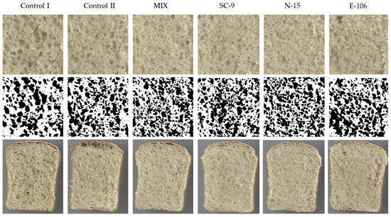 Crumb appearance and binarized images of bread samples using ImageJ2x version 1.54c.