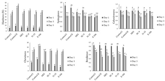 Textural properties of breads on day 1, 3 and 5. Different small letters on the columns show the significant difference between the breads for each textural parameter prepared with or without LAB starter (p < 0.05).