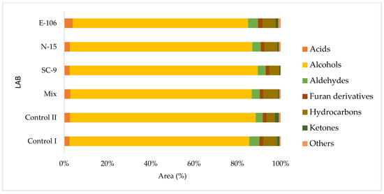 The levels of volatile organic compound groups for each bread relative to peak area (%).