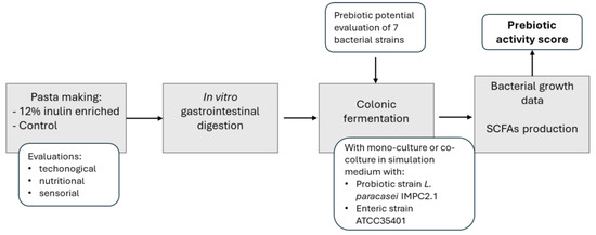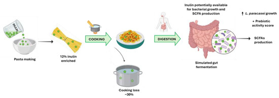 Inulin-enriched pasta was then subjected to different analyses to ascertain its technological and nutritional quality and to in vitro gastrointestinal digestion followed by simulated gut fermentation, as reported in Figure 1.