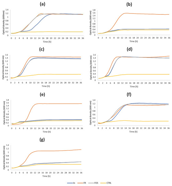 Growth kinetics of L. casei 431 (a) and 01 (b), L. paracasei IMPC2.1 (c) and IMPC4.1 (d), L. rhamnosus GG (e), B. animalis subsp. lactis Bb12 (f) and L. paracasei/casei strain P1 (g), without sugars (negative control, yellow line), or in the presence of 1% fructose (FR, orange line) or fructoligosaccharides (FOS, grey line) or chicory inulin (In, blue line) as monitored by the Bioscreen C. The induction period (period until onset of the exponential growth phase used) was calculated as a measure for the duration of the lag phase; the bacterial growth was monitored up to 48 h even if the graph shows the first 36 h, since OD remained stable until the end of experimental period.