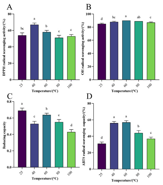 Effect of different temperatures on antioxidant activity of WPH-Se. (A) Effect of temperature on the scavenging rate of DPPH radicals. (B) Effect of temperature on OH radical scavenging rate. (C) Effect of temperature on the reducing capacity of Fe3+. (D) Effect of temperature on the scavenging rate of ABTS radicals. Note: Different letters indicate a significant difference (p < 0.05).