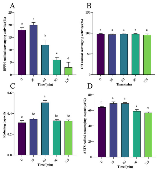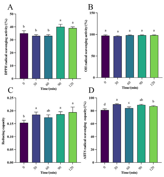 Effect of gastric digestion on antioxidant activity of WPH-SE in vitro. (A) Changes in DPPH radical scavenging activity in simulated gastric digestion of samples. (B) Changes in OH radical scavenging activity in simulated gastric digestion of samples. (C) Changes in reducing capacity of Fe3+ in simulated gastric digestion of samples. (D) Changes in ABTS radical scavenging activity in simulated gastric digestion of samples. Note: Different letters indicate a significant difference (p < 0.05).