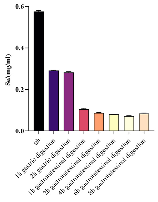 The data showed that the selenium content in a solution (5 mg/mL) of WPH-Se was 0.577 mg/mL, corresponding to 11.54% of the total solution concentration (Figure 6). After gastric digestion, nearly half of the selenium in WPH-Se remains free, suggesting some degree of precipitation. The slightly acidic environment of the intestine, with pH 6.8, facilitates the dissolution and absorption of WPH-Se. Once precipitated in the gastric, WPH-Se is resolubilized in the intestine, facilitating the release and absorption of free selenium. Previous studies indicated that organic forms of selenium, typically bound to natural proteins or amino acids, are better absorbed and utilized by the human body compared to inorganic forms [66,67]. This suggests that WPH-Se may be beneficial for enhancing selenium absorption in the human body, potentially contributing to the development of effective selenium supplements.