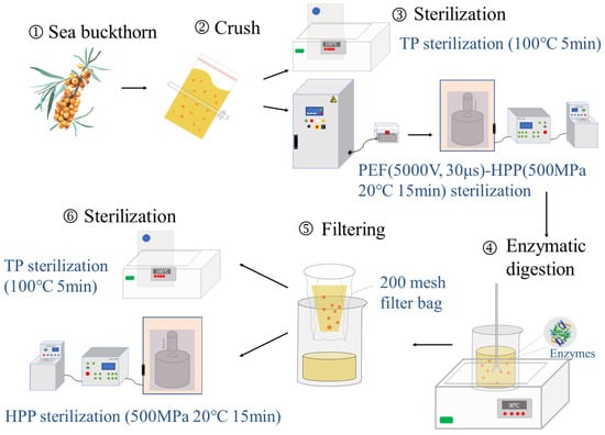 Sea buckthorn (Hippophae rhamnoides L. or Elaeagnus rhamnoides L.), also known as vinegar willow, sour thorn, dapple, and so on, is a deciduous shrub or tree in the family Hippophae, belonging to small berry fruit trees [1]. Sea buckthorn is native to cold-temperature regions of Asia and Europe, although it is currently primarily dispersed in 45 nations and regions with moderate climates in Eurasia [2]. As a medicinal and food plant, the whole plant tissue of sea buckthorn contains approximately 200 active components, including various types of vitamins, flavonoids, phenolic compounds, amino acids, fatty acids, and tannins [3]. Sea buckthorn contains the most polyphenols, especially phenolic acids and flavonoids, and the amount of vitamins and flavonoids is several times that of oranges, hawthorns, and blueberries. Sea buckthorn has been used in medical treatment due to its high fatty acid content, which improves cardiovascular health and raises cholesterol [4]. Sea buckthorn juice can retain its original nutritional value, and it is convenient to drink. These properties make it dominate among sea buckthorn drinks. However, as freshly squeezed sea buckthorn juice has a short shelf life, some processing processes must be utilized to extend it. Sterilization is an essential step in the processing of fruit and vegetable juice, as it directly determines the quality and safety of the juice [5].