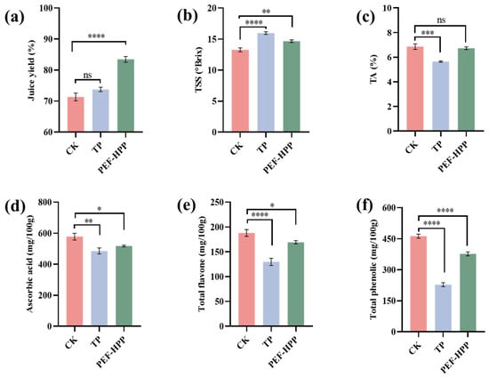 Composition characteristics of different treatment juices: (a) juice yield; (b) TSS; (c) TA; (d) ascorbic acid content; (e) total flavone content; (f) total phenol content. Asterisks indicate statistical significance at different levels of adjusted p-values: ns, p > 0.05; * p < 0.05; ** p < 0.01; *** p < 0.005; **** p < 0.001.