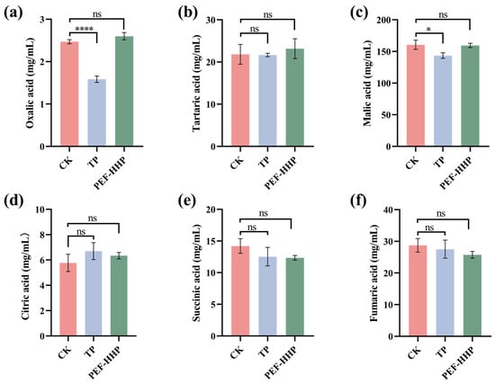 Organic acid content of different treatment juices: (a) oxalic acid; (b) tartaric acid; (c) malic acid; (d) citric acid; (e) succinic acid; (f) fumaric acid. Asterisks indicate statistical significance at different levels of adjusted p-values: ns, p > 0.05; * p < 0.05; **** p < 0.001.