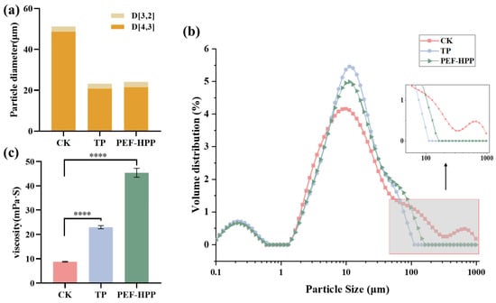 3.6. Effects of TP and PEF-HPP on Particle Size Distribution and Viscosity