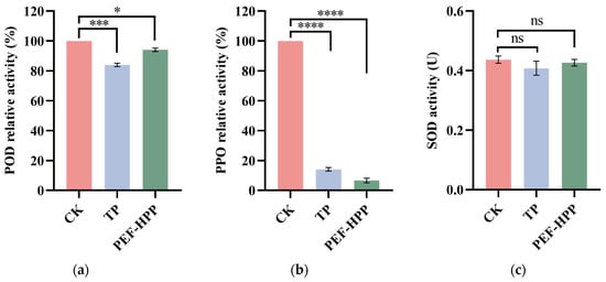 POD relative activity (a), PPO relative activity (b), and SOD activity (c) in different treatment juices. Asterisks indicate statistical significance at different levels of adjusted p-values: ns, p-value > 0.05; * p < 0.05; *** p < 0.005; **** p < 0.001.