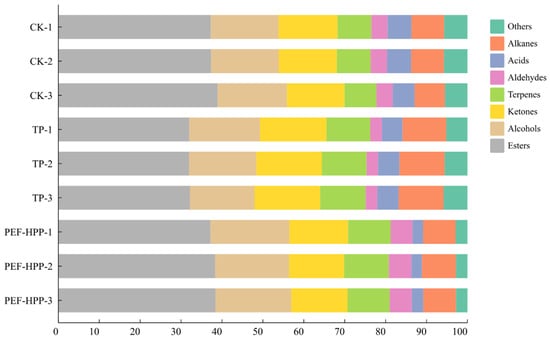 Fruit aroma is predominantly contributed by various volatile esters present in fruits, which are often fruity and floral, imparting a fresh, sweet flavor and mouthfeel to sea buckthorn juice [58]. As shown in Figure 6, the ester level of TP-processed sea buckthorn juice (32.00%) fell significantly (p < 0.001), but the PEF-HPP group (37.93%) did not differ significantly from fresh sea buckthorn juice (37.86%). This is congruent with the findings of Wu et al., who processed pineapple juice and discovered that PEF and HPP had less of an influence on the juice’s esters, allowing for improved retention [7]. Alcohols constitute the second-largest group of volatiles in sea buckthorn juice. The alcohol content in sea buckthorn juice increased after PEF-HPP processing (18.62%). PEF and HPP were discovered to potentially produce additional aromatic chemicals while processing orange juice [59]. The highest content of ketones was observed after TP. Ketones are mainly produced by the oxidation of unsaturated fatty acids or by microbial metabolism during fermentation. Heating promoted oxidation, reduction, and hydrolysis reactions in sea buckthorn juice, resulting in the breakdown and transformation of alcohols, ketones, and ester [60].