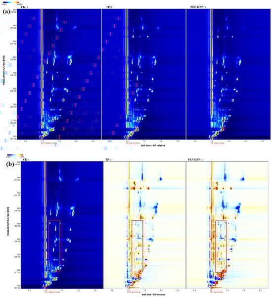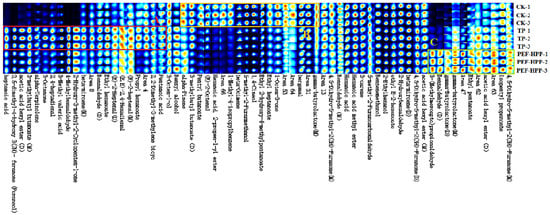 The CK served as the reference, and the spectra of the other two groups of samples were subtracted from the reference. In the subtracted spectra, white indicated the cancellation of the same substance concentration, red indicated a higher concentration than in the reference, and blue indicated a lower concentration than in the reference, with darker colors indicating significant differences. In drift times of 1.0–1.5 s, the concentration of VOCs in sea buckthorn juice after PEF-HPP was significantly higher than TP and CK. The concentrations of VOCs in the juice after PEF-HPP and TP at 1.5–2.0 s were lower than those in the CK. To precisely determine the specific composition of different compounds, researchers required in-depth statistical analyses of the combined volatility profile information from different samples (Table 2 and Figure 8).